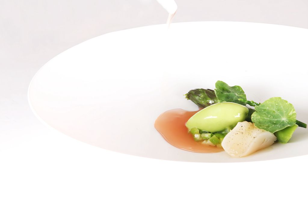 料理長緒方雲結合藝術與建築背景,將色彩、光影融入料理顏色、盤飾,料理多元運用日本清酒提出海鮮甜味,添加炭焙水仙、烏龍、金萱茶提味,串接於料理間五感體驗,10道料理清爽不失香醇、濃郁不顯厚重。