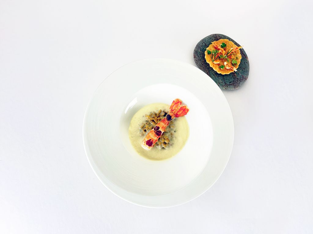牡丹蝦.櫻花蝦.斯卑爾特小麥選用法國斯卑爾特小麥作成燉飯,獨特堅果香氣多了點甜。牡丹蝦經白酒、蔬菜高湯溫泡後鮮甜濃郁,與燉飯融為一體。櫻花蝦餅置放於旁側嶙峋礁石上,入口脆感十足。