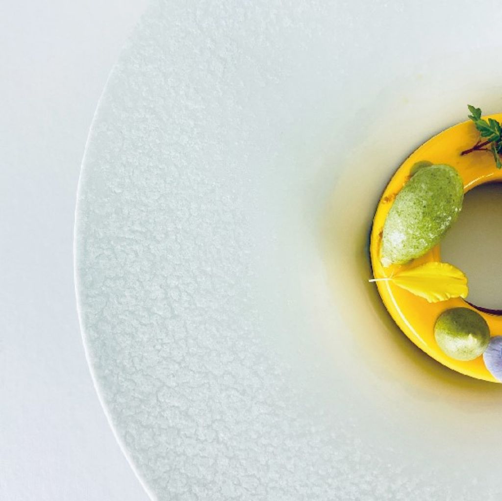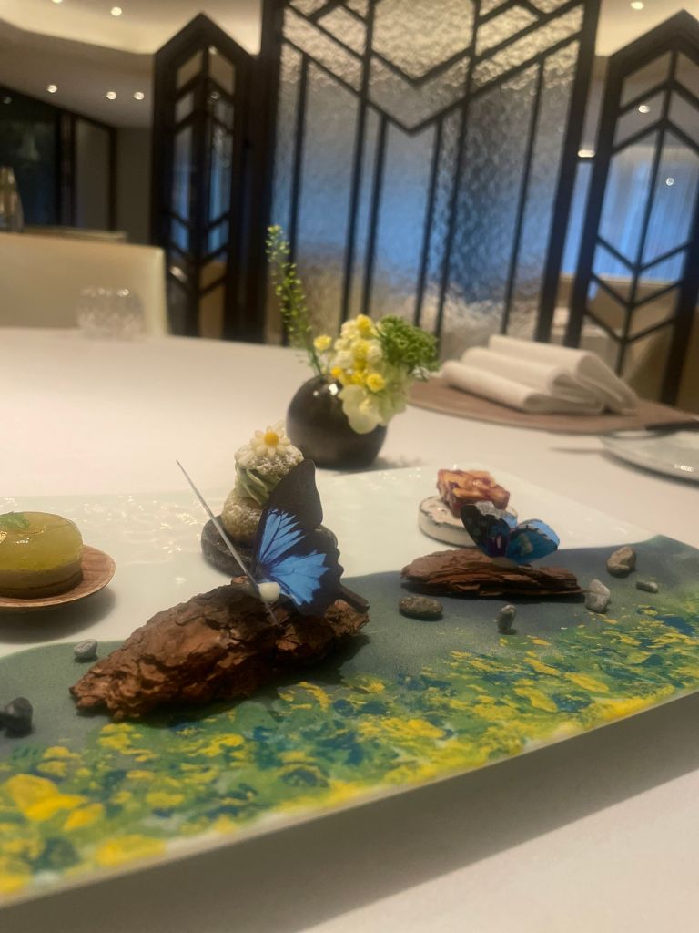 終曲Petit Four以青蘋果薄荷果凍、碧螺春泡芙與杏仁軟糖3款口感製造驚喜,盤飾為臨摹莫內畫作吉維尼花園色彩,潑灑黃綠繽紛交疊,呈現自然完美生動氛圍感。