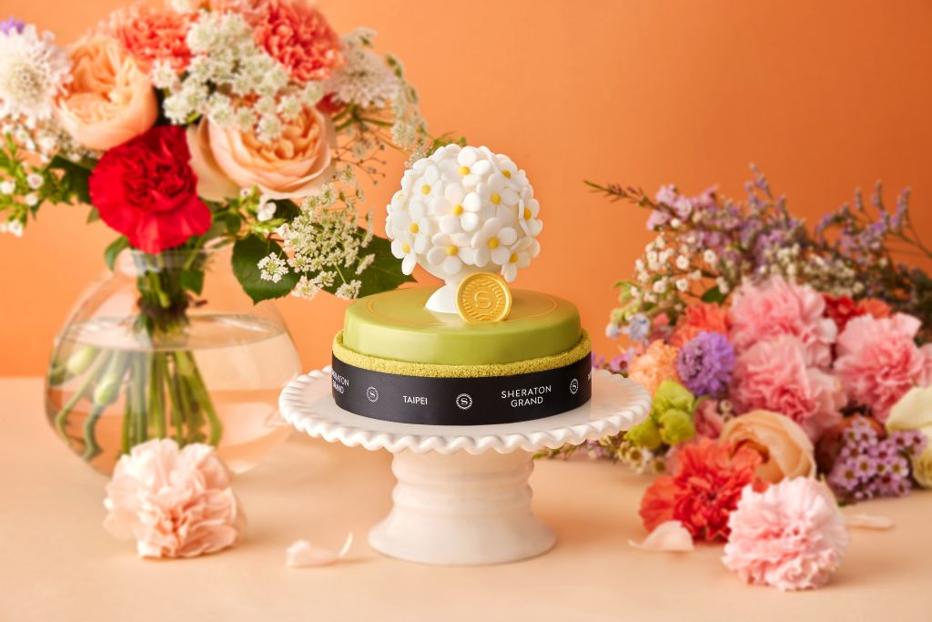 台北喜來登大飯店呈獻”愛.盛放""杏桃抹茶慕斯母親節蛋糕,由世界巧克力大師賽冠軍鄭吉賢行政主廚精心呈現,高顏值小雛菊花園優雅吸睛。