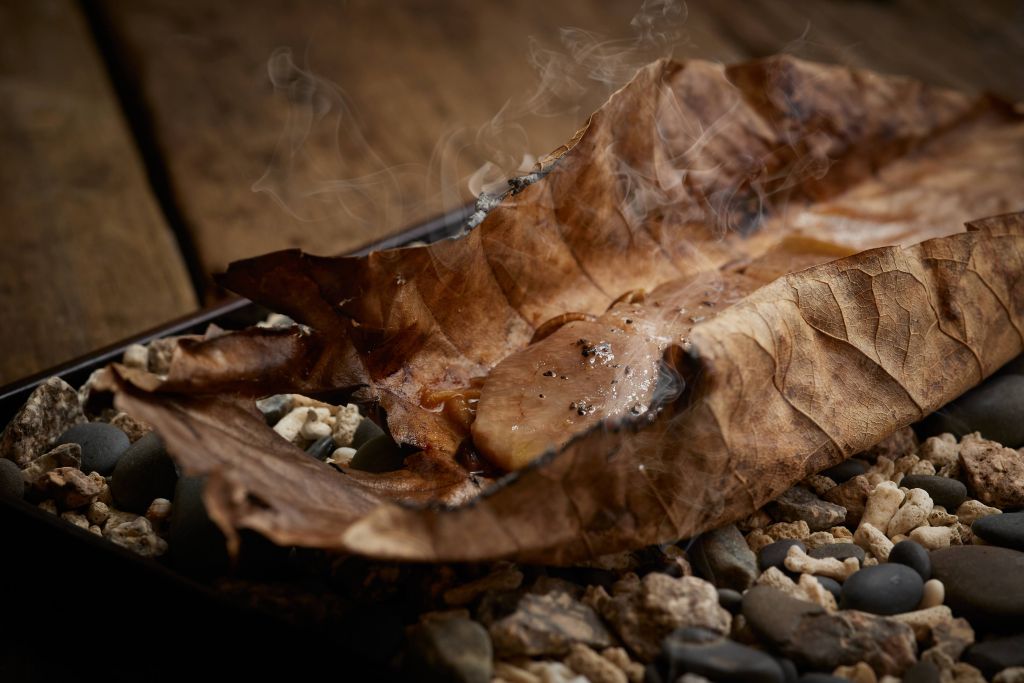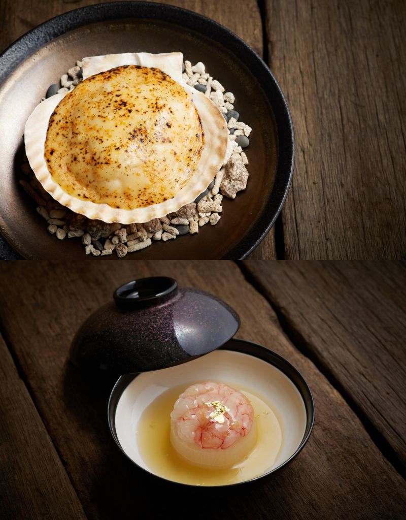 帆立貝燒:選用春天當季日本青森漁獲評價第一的帆立貝,取下來後外殼洗乾淨做成烹煮器皿,是青森人惜物象徵,也被視為傳家寶。奶油炒過的洋蔥帶出帆立貝的鮮甜,鋪上帆立貝與鮮甜海膽,濃郁白醬焗烤後如倒映在海面上落日,緋魚卵入口啵啵乍響如在口中綻放的煙火。