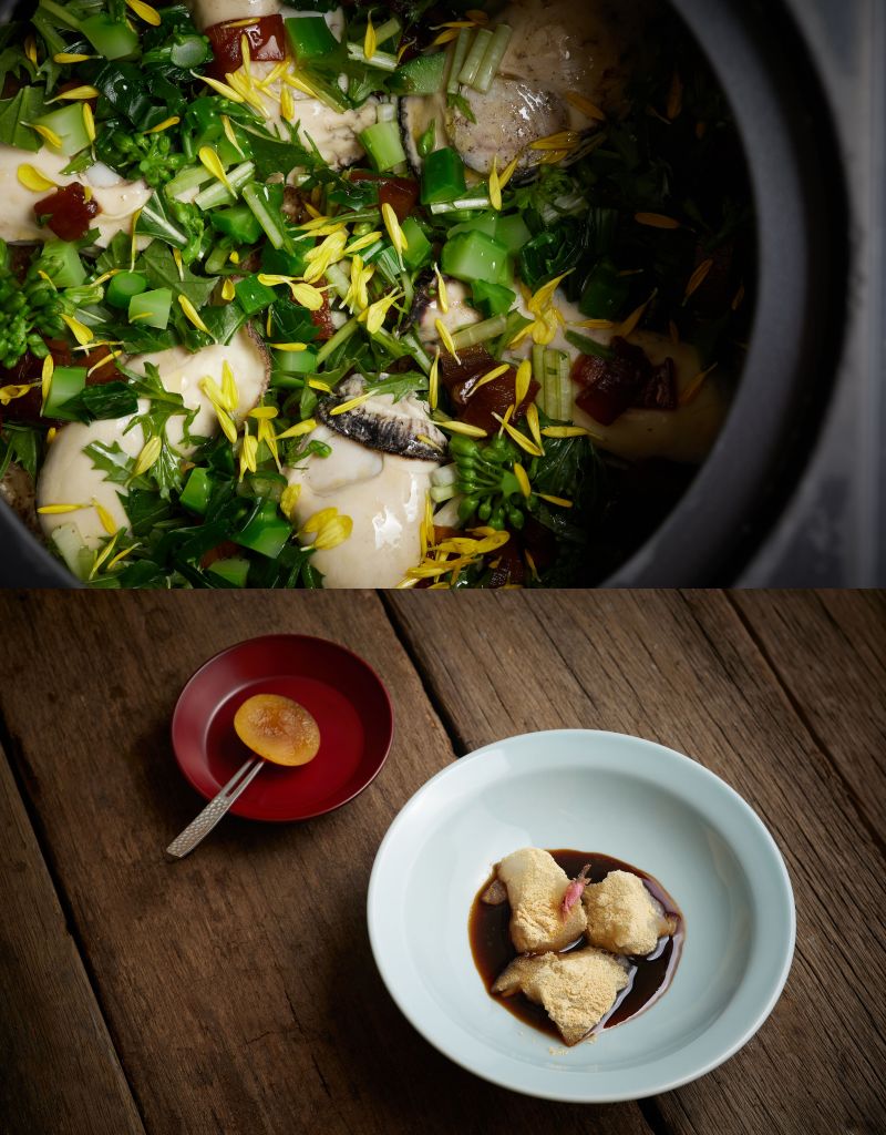 生蠔山菜干瓢釜飯:招牌釜飯選用廣島純淨無汙染海域肥美生蠔,拌上甕仔雞雞油、花椒、旬味野菜與干瓢,讓生蠔鮮味與甘瓢甜味、春蔬香氣與Q彈蓬鬆米飯一起吃進春意盎然的繽紛口感。