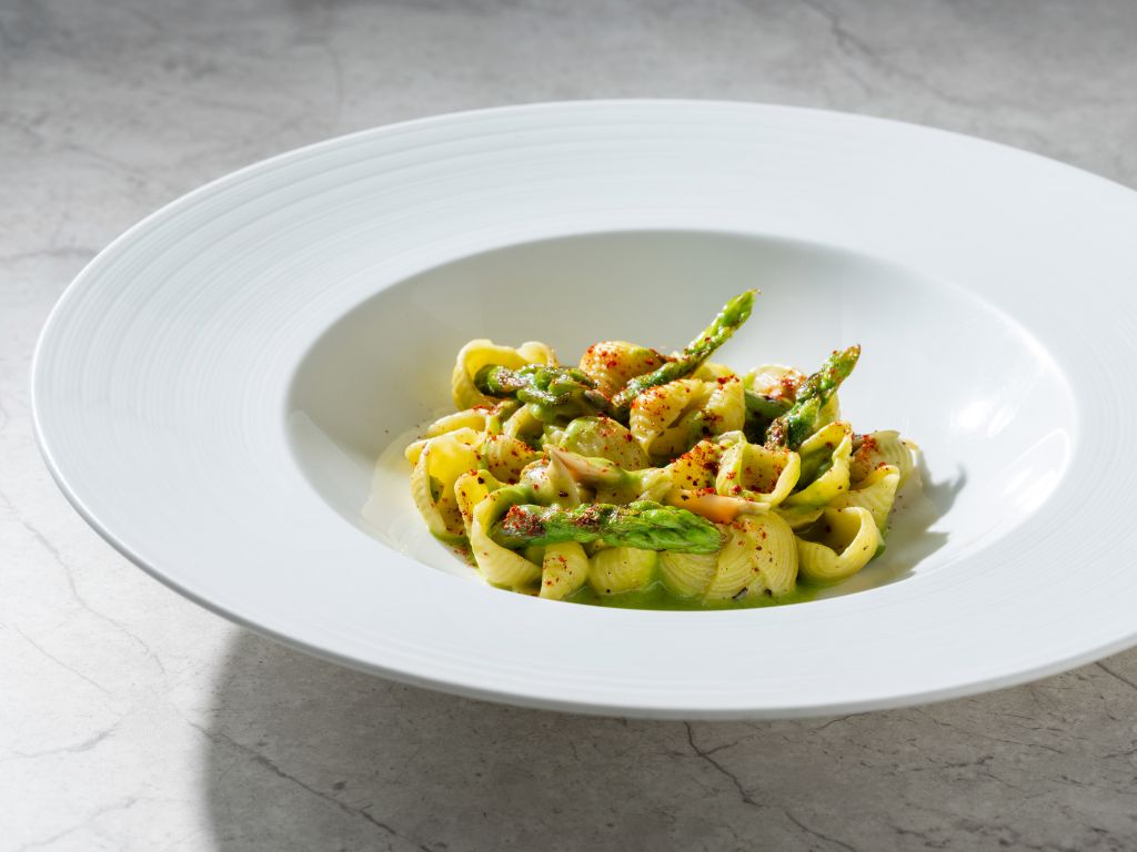 手工貝殼麵、大蒜、蛤蜊、綠蘆筍:主廚將綠蘆筍切成小碎塊後乾煎保留脆感,與手工貝殼麵、白酒、大蒜、蛤蜊汁一同炒製,加入蛤蜊、綠蘆筍泥及最脆甜的蘆筍尖端,最後撒上七味粉,融合海味蛤蜊與清新蘆筍,鮮甜清爽的滋味是春日最佳享受。