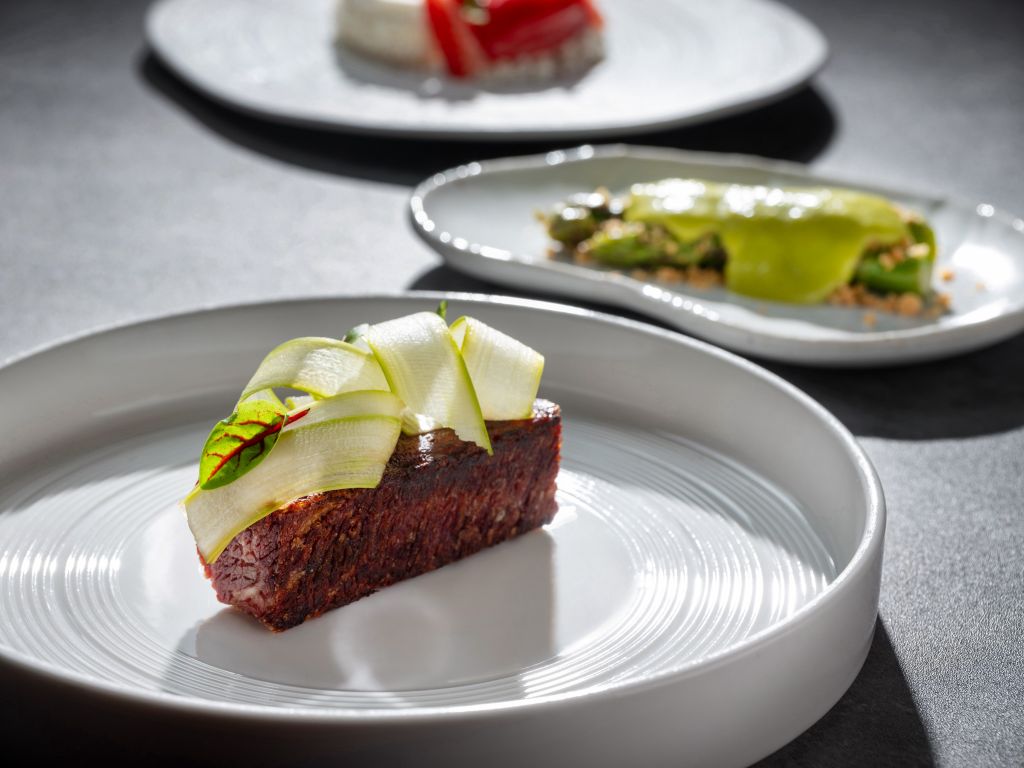 慢燉頂級牛小排、綠蘆筍、帕瑪森乳酪碎、牛肉汁:艾曼紐主廚將澳洲穀飼牛小排以鹽、月桂葉與鹽之花隔夜鹽水漬,舒肥讓香氣更融合,切塊後淋上牛肉汁並刨上新鮮綠蘆筍片。另將綠蘆筍燙過炙烤,撒上帕馬森起司碎並淋上法式伯那西醬。肉質軟嫩細滑牛小排,搭配爽脆多汁炙烤過清甜蘆筍,風味與口感極富層次,交織出難忘的春日滋味。