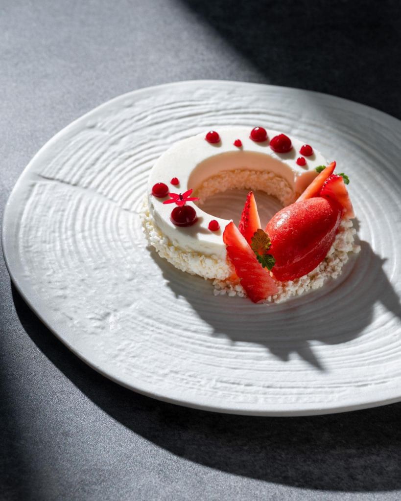 椰子慕斯、白巧克力碎、草莓雪酪:以春夏必嚐椰子製成基底海綿蛋糕與椰子慕斯,搭配新鮮草莓與草莓雪酪,撒上甜蜜的白巧克力碎。