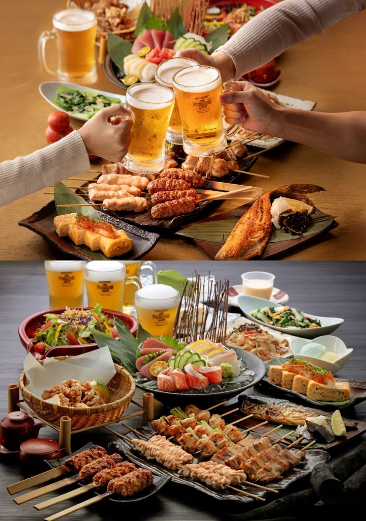 全新雙人套餐從前菜到串燒、主食皆有,和風芥末洋蔥沙拉、多道備長炭火現烤串燒、炭烤鯖魚、和風雞唐揚、京風小魚乾玉子燒與甜點通通涵蓋在內,還有飽足感十足,從生米開始烹調獨家鳥丈雞肉溫泉蛋釜飯可享用,附有沁涼暢快的三得利頂級生啤酒或無酒精飲品。