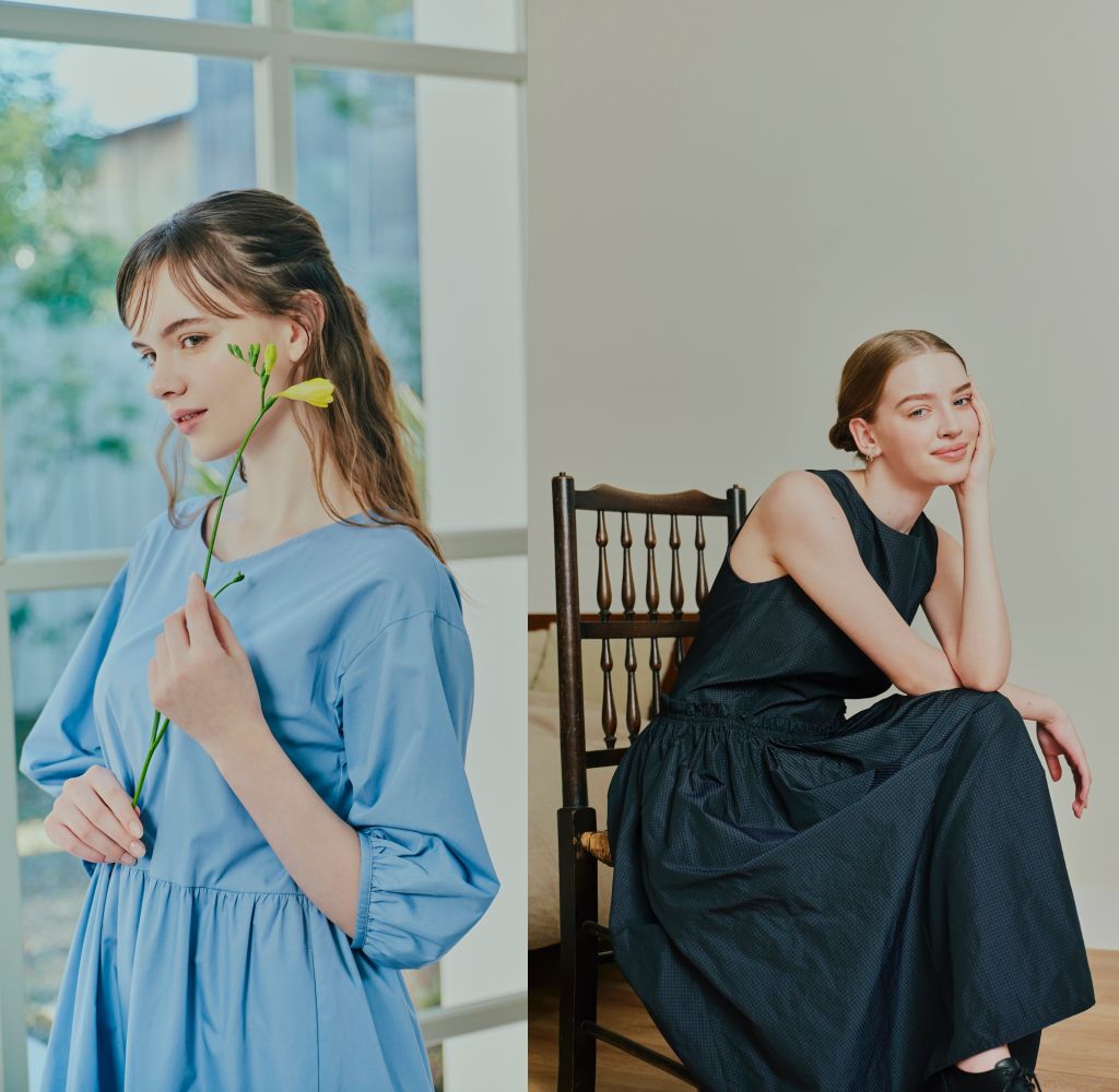 面料選用輕磅天然棉、棉與尼龍混紡,表面帶有細膩光澤,增添高舒適度彈性設計,令女孩姿態更顯搖曳輕柔。以灰藍、淺藍、淡粉等低飽和度色彩為基調,並大量注入米白色,為造型彰顯自然清新氛圍。