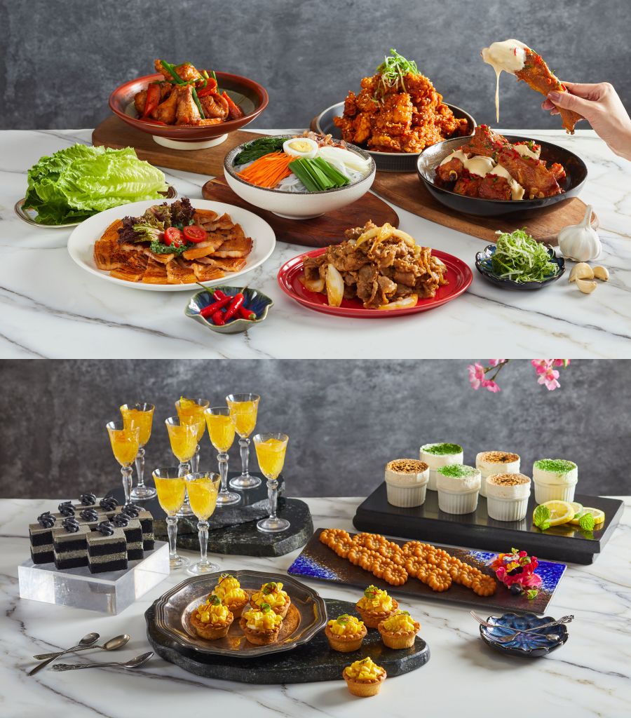 起司豬肋排邪惡牽絲吮指回味,韓國烤肉有Q彈富嚼勁明洞烤五花,韓式烤和牛軟嫩多汁。韓式炸雞香辣過癮,泡菜豬肉、雜菜粉絲、韓式豆腐煲等美味應有盡有。冷食區供應正韓泡菜、涼拌章魚、橡實凍、麻油菠菜、涼拌蔬菜冬粉等開胃小菜。