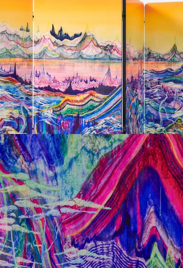 黃宇興中尺寸作品《中國風景》展現中國古典山水圖景與光怪陸離的色彩碰撞,碳纖維兩折屏風為載體再現意趣非凡藝術格調,以極富辨識度超現實表達傳遞藝術家心中獨特東方意境與人文情懷。