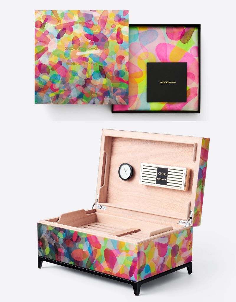 《氣泡》裝飾圖案呼應碳纖維材質輕巧質感,多元美感和諧相融,以屏風、條案、擱架及雪茄盒豐富形式自由融入現代家居場景;深藍色、粉紫色與朱紅色不規則橢圓形,透過絲巾,碰撞出輕盈躍動愉悅感。
