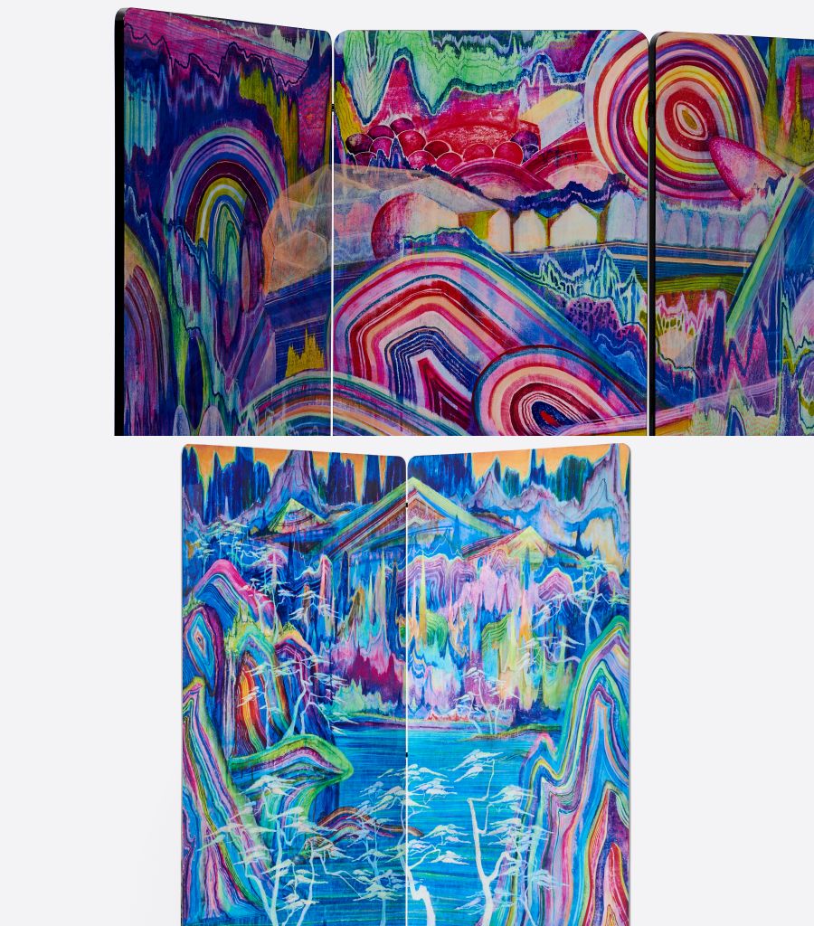 SHANG XIA上下合作款碳纖維六折屏風分別選用藝術家黃宇興《九龍圖》與《江山如此多嬌》2幅代表性畫作:《九龍圖》將龍的形象幻化為九棵連貫天地的松樹,見證歷史與時代流轉更迭,凝聚自然山水雄渾力量,色彩瑰麗,筆法精準克制展現強烈視覺存在感。