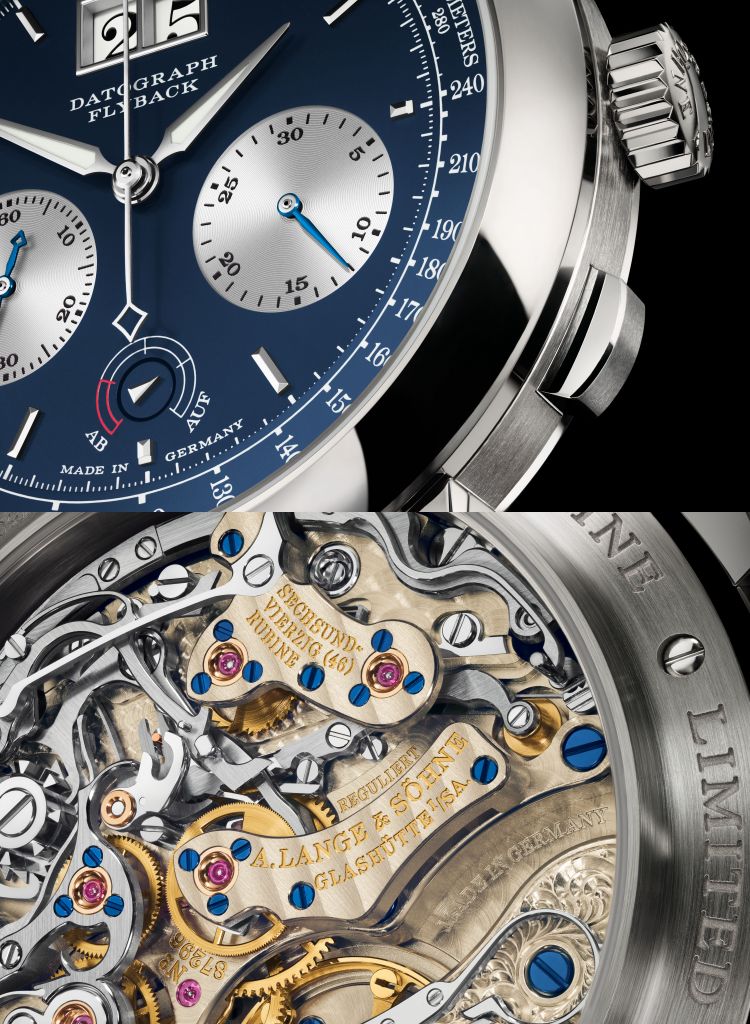 朗格2024年W&W鐘錶與奇蹟日內瓦高級鐘錶展隆重揭曉DATOGRAPH大日曆計時系列2款新作:搭配黑色錶盤的鉑金950款&18K玫瑰金錶款,新推出搭配藍色錶盤的18K白金款,限量125枚。這款腕錶憑藉獨特配色與醒目外觀脫穎而出。