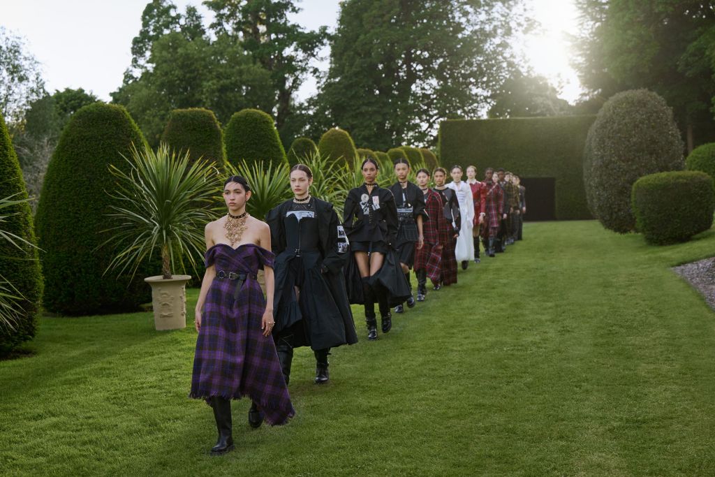 Maria Grazia Chiuri融合蘇格蘭象徵的獨角獸、薊花、小碎花千花紋樣(Millefleurs)轉化為精美刺繡,展示卓越工藝。格紋面料貫穿整個系列,從經典蘇格蘭裙到Bar Jacket。以天鵝絨與編織漁網展現懷舊情愫,相互交織構成時光旅程中的故事,激發靈感。