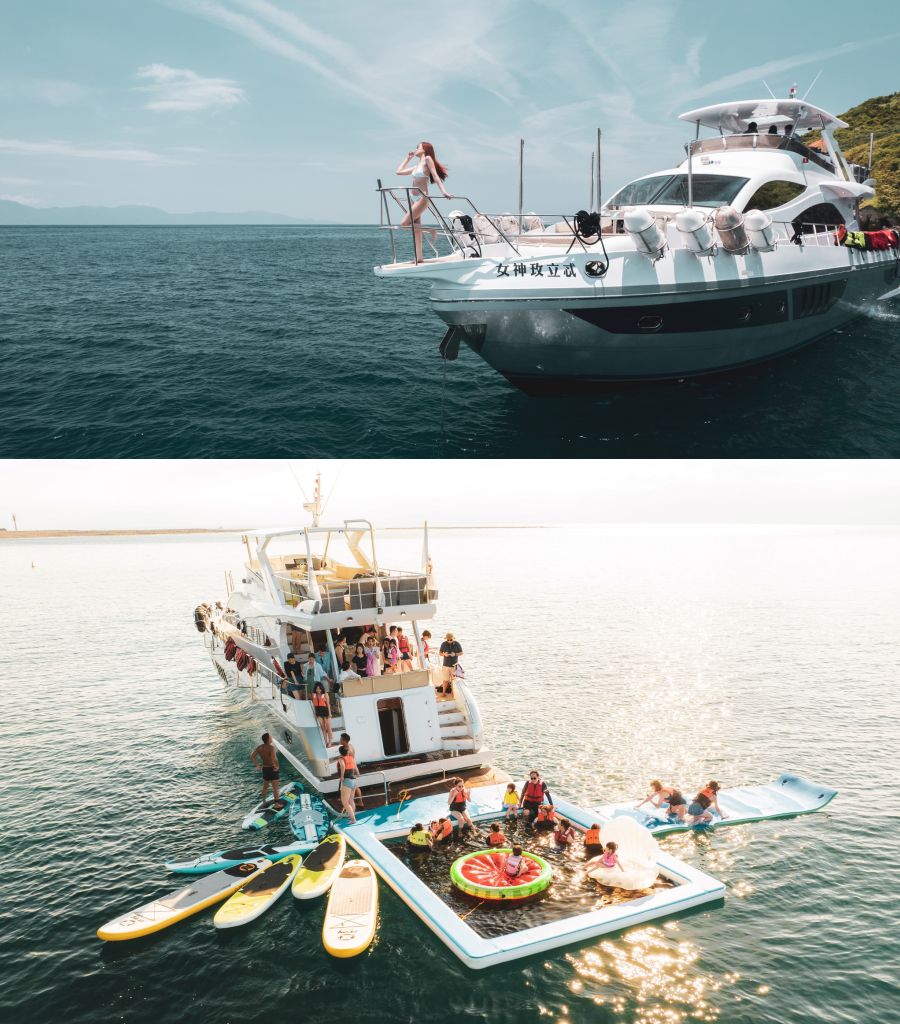豪華遊艇包船專案10人成團,加價可升等至獨棟泳池別墅。在接近4小時航行時間裡,欣賞牛奶海與天空藍漸層色澤,一路綿延至半個龜山島海岸線,沉浸在絕美海洋裡,恣意享受SUP立槳、水上溜滑梯及船上豪華設備,更有遊艇管家代烤BBQ,提供冰涼礦泉水及運動飲料,