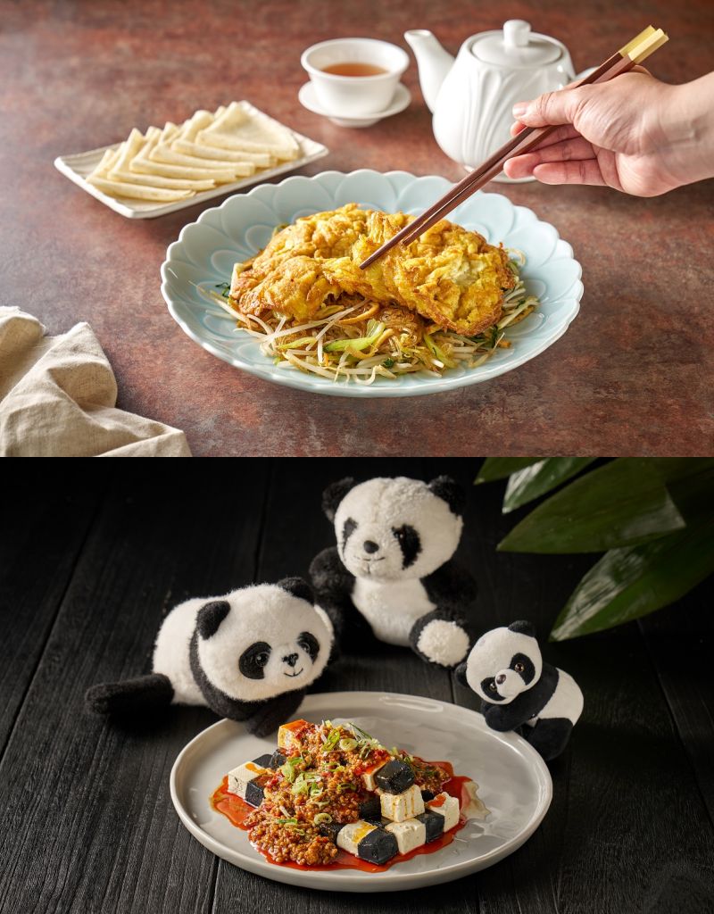 “熊貓麻婆辣豆腐"以卡通劇情中奇幻麻婆豆腐為原型設計,使用黑豆漿加墨魚汁、竹炭粉做出黑色豆腐,交錯白豆腐勾勒熊貓顏色,搭配20種以上香料製成獨家麻辣醬,淋上香辣油及麻香藤椒油,口味麻辣、汁濃味足。