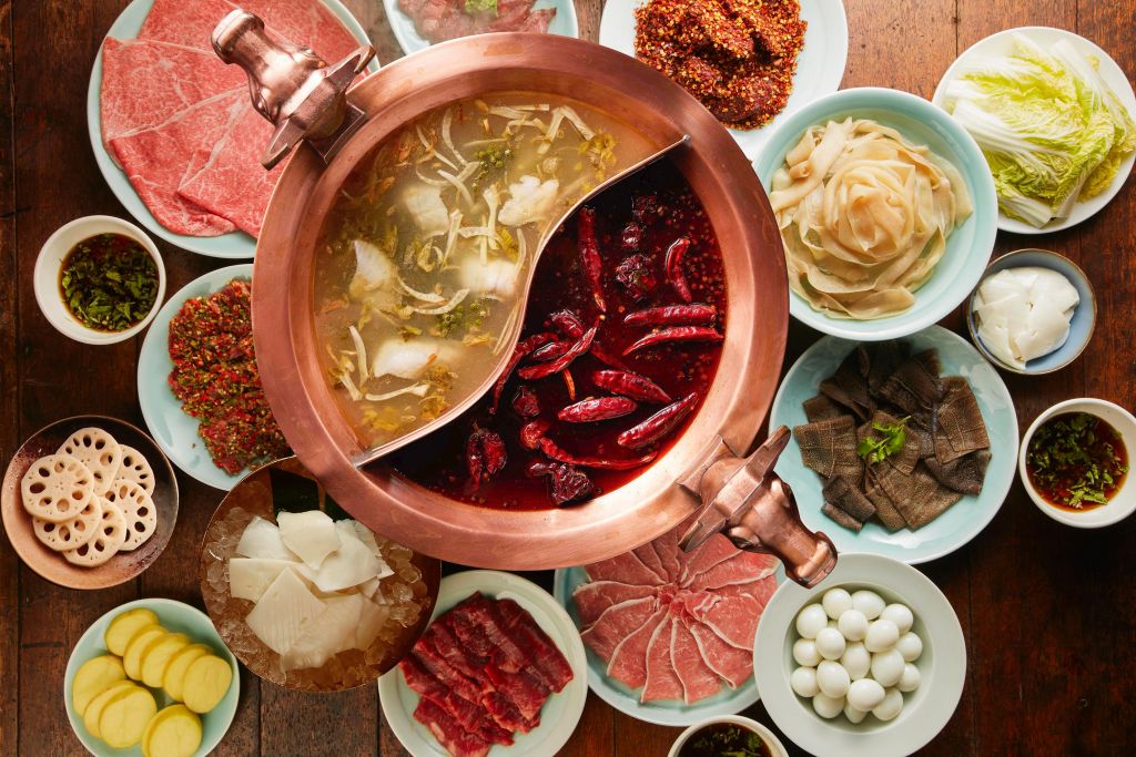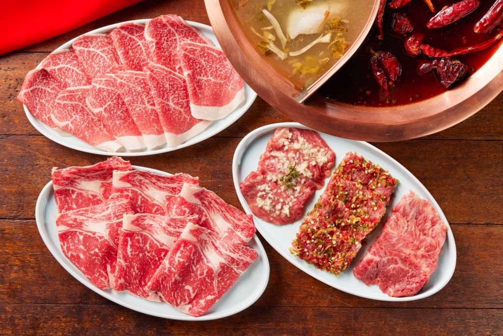 精選食材中吃得到”重慶老三樣"爽脆牛毛肚、生鮮豬黃喉、脆彈鴨腸,還有脆口貢菜、鵪鶉蛋、午餐肉等當地經典配料。特別以藤椒、泡椒等辛香料醃製澳洲嫩牛肉,呈現別具特色牛肉風味。