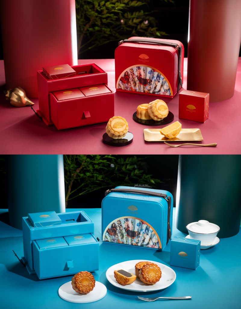 台北文華東方酒店中秋月餅禮盒共典雅紅與經典藍提盒、禮盒款及小提包4款設計,以生活靈感為設計主軸,結合手提包輕便攜帶與收納盒置物創意構思,賞心悅目兼具實用性。