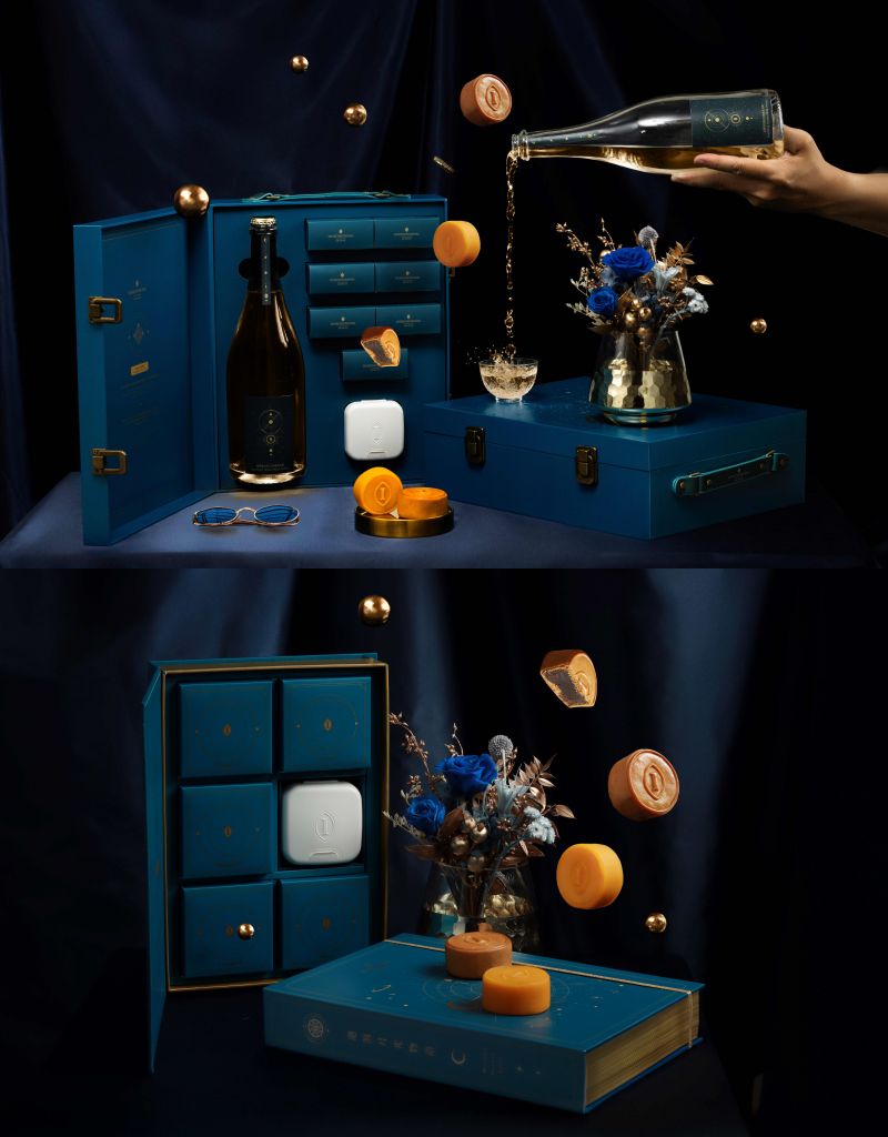 高雄洲際酒店港灣月途線系列誠摯推出經典版”港灣月光物語"及奢華版"港灣旅人行囊"2款獨具匠心月餅禮盒,以港都返鄉為靈感,巧妙結合中秋月圓意象與高雄港灣獨特風光,顏色選用沉穩寧靜港灣星塵藍搭配月影夢光金細節,營造浩瀚夜空中明亮月光,部分燙金設計,彷彿月光灑在港灣水面上,閃爍迷人光芒。