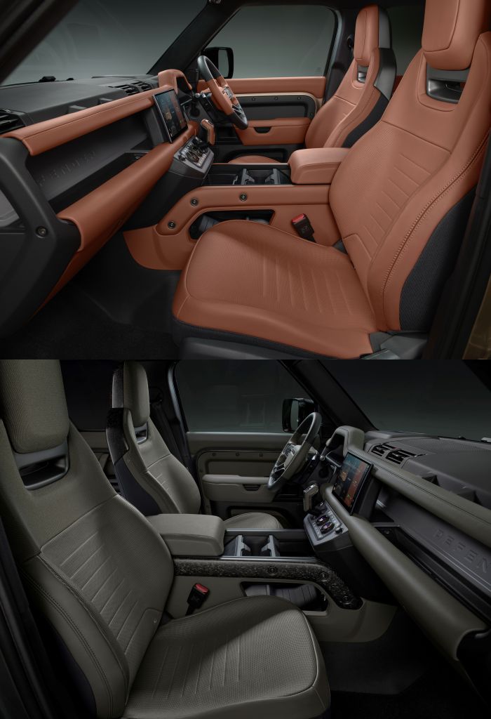 車室內裝提供2款高度耐用UltrafabricsTM PU選項,座椅飾面是DEFENDER OCTA Edition One標準飾面,搭配卡其色與檀木黑雙色對比,採用針織面料與簡約無縫內飾、切削碳纖維飾件與20吋鍛造鋁合金輪圈,並可選擇全地形輪胎。