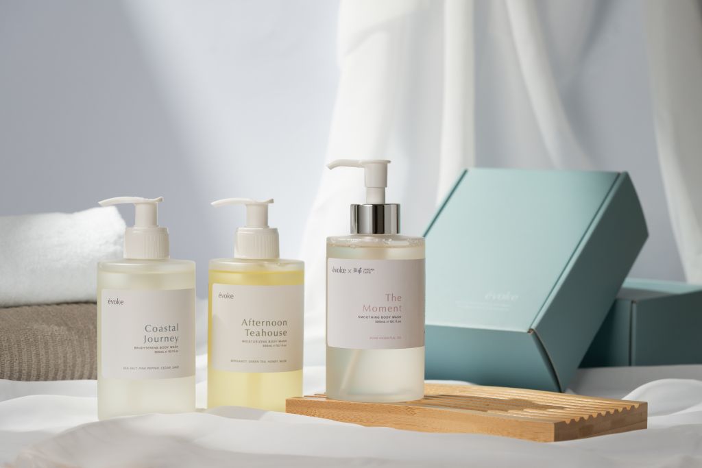 Évoke醒沐留白時刻舒緩沐浴露專為敏弱肌膚量身打造,透過天然有效成分,為敏弱肌提供真正溫和有效的沐浴露。”濱海旅行淨白沐浴露”及”午後茶室潤澤沐浴露”2款沐浴露香氣迷人,擁有多種養膚成分,使肌膚光滑透亮,讓沐浴沐浴成為身心雙重寵愛享受,滋潤肌膚完美體驗,讓心靈得到深度放鬆,擁抱自我。