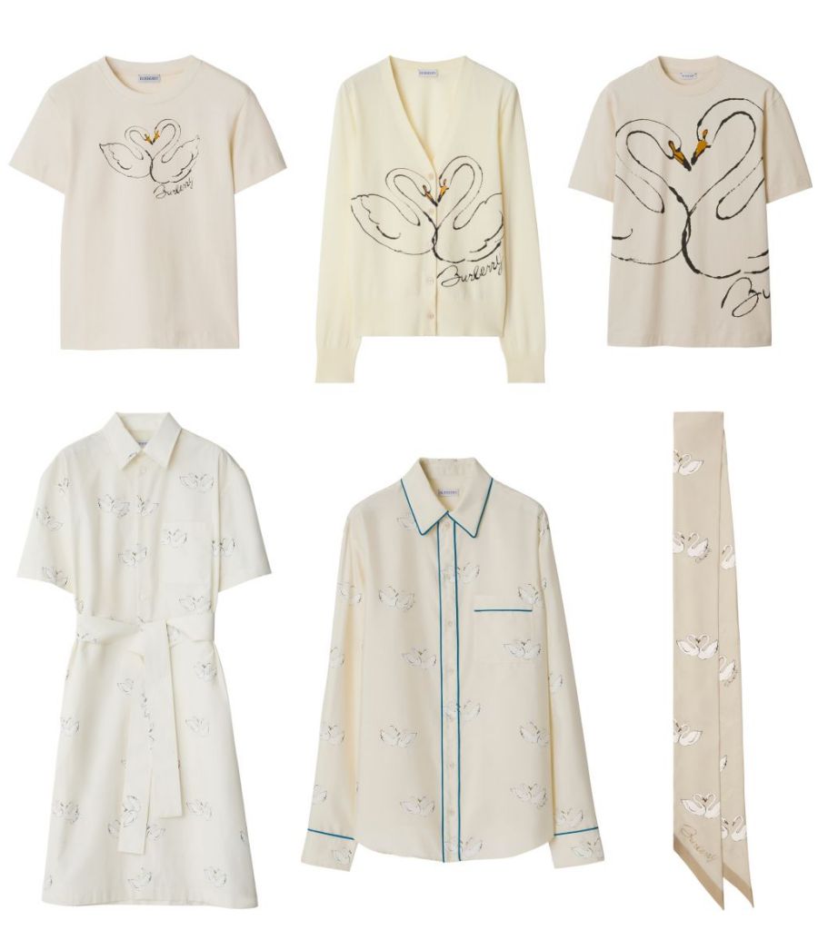 女裝包括絲質睡衣式襯衫與百褶裙,成套棉質縐綢開襟針織衫與上衣,皆採用本季主打皂白色。 男裝包括棉質短袖襯衫、短褲、多款上衣,搭配印有天鵝圖案與BURBERRY字樣絲巾。