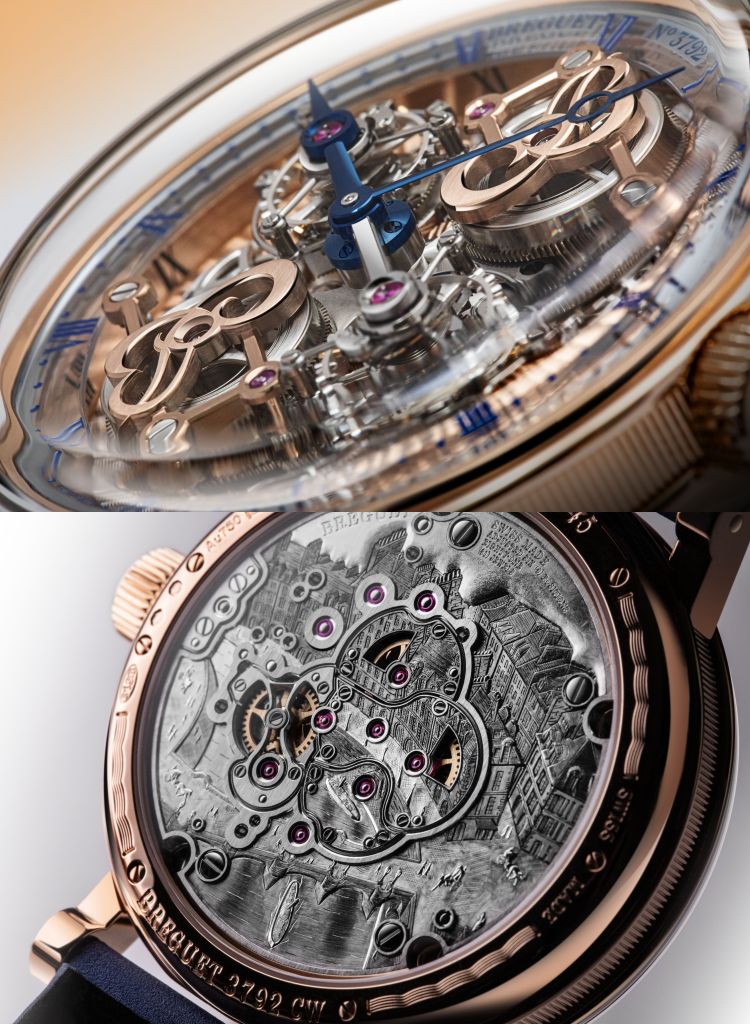 從錶盤側面觀看腕錶,可見2個陀飛輪複雜舞動形成時間顯示一部分,橫桿依附於中央主夾板,配備特別複雜裝置每12小時旋轉1次,轉化為具寶璣特色風格時針。