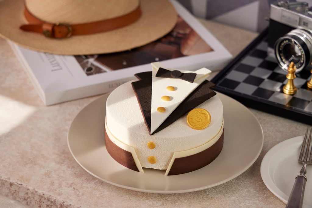 爸爸好芒焦糖椰子芒果蛋糕帥氣西裝造型致敬辛勤的魅力老爸,口味選用清爽椰子結合酸甜芒果,新鮮椰奶結合法國頂級鮮奶油製成綿密慕斯,風味更清爽,包裹盛夏金煌芒果及清甜荔枝製成水果凍,層層堆疊以芒果與椰奶製成濃香奶餡,及口感鬆軟雙層椰子達克瓦茲,層次豐富甜而不膩。