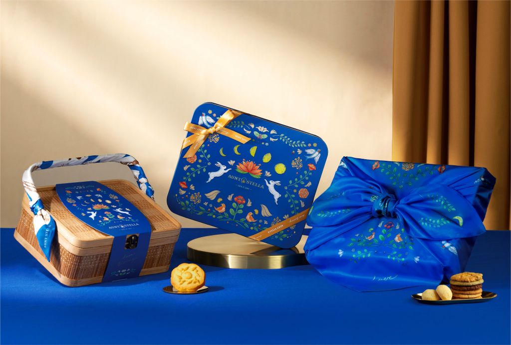 Aunt Stella詩特莉與陽光社會福利基金會合作推出”星夜花語”精緻鐵盒、"玉兔漫步"永續環保禮盒、"星夜之盛"手工竹籃禮盒,及日式風呂敷"星夜之錦"禮盒等多樣化款式,有經典手工餅乾、滿載秋季氣息"日本和歌山柚香月餅"與"法式羅勒番茄餅乾",及經典復刻回歸"九鬼胡麻兔子餅乾"與"高樹鄉金鑽鳳梨酥球"。禮盒內容可選擇磅蛋糕或東方美人茶組合。