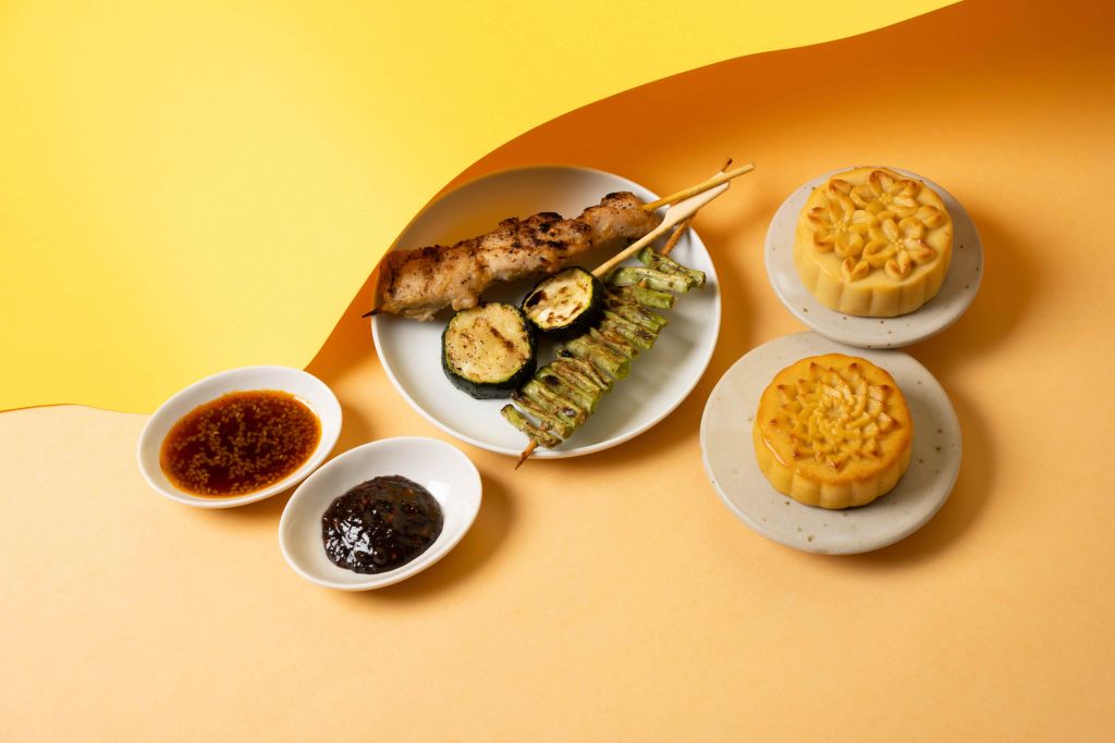 微熱山丘茅乃舍中秋禮盒上層擺放中秋限定鳳梨奶黃月餅及紅玉蘋果月餅,下層加入茅乃舍特製燒肉醬與烤香蒜味噌醬。特製燒肉醬選用日本大豆與小麥製成優質醬油,加入大蒜、芝麻、柿子醬與北海道昆布,提升燒烤風味。烤香蒜味噌醬使用日本大蒜細膩磨烤後混合五穀味噌,濃郁香氣為料理增色。