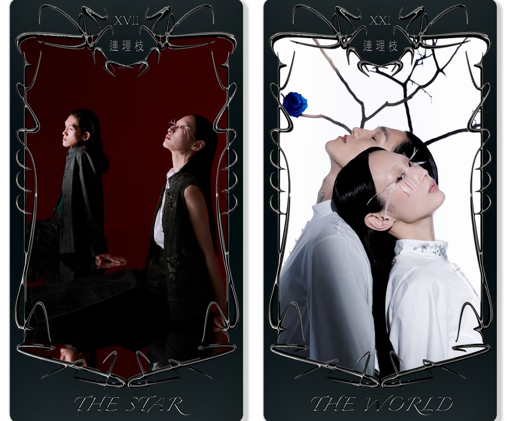 東方塔羅牌I:比翼鳥,分別透過一張戀人、一張惡魔塔羅牌卡,引申看見愛情不同面向。雪白戀人牌卡以長領結蕾絲雪紡上衣與短褲,呼應男裝一襲刺繡領飾雪紡白衫;惡魔牌卡以立體黑玫瑰拼接網紗洋裝、羊毛料西裝外套靜謐卻精緻繁複,雙雙堆疊出戀人不同互動的模樣。