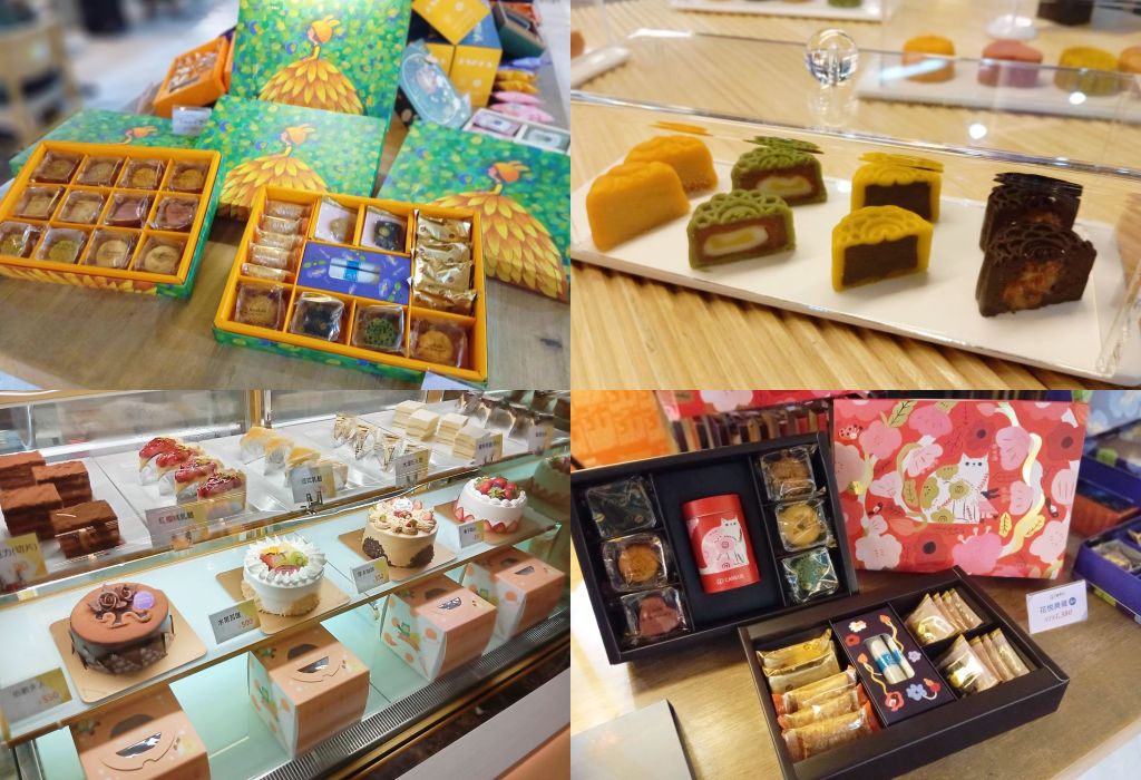 2024年喜憨兒中秋系列幾米插畫的綻放微笑禮盒,這款精緻鐵盒內有廣式棗泥核桃月餅及西式萊姆葡萄夾心。花悅典藏雙層禮盒圖面為Cindy Wume繪製的貓咪圖案,包含所有經典月餅、各式餅乾及遊山茶訪限定款茶罐。兒童島繪製的小狐狸禮盒月亮奇遇記,有2024新品杏仁千層酥、香橙檸檬酥及鐵觀音奶茶月餅。