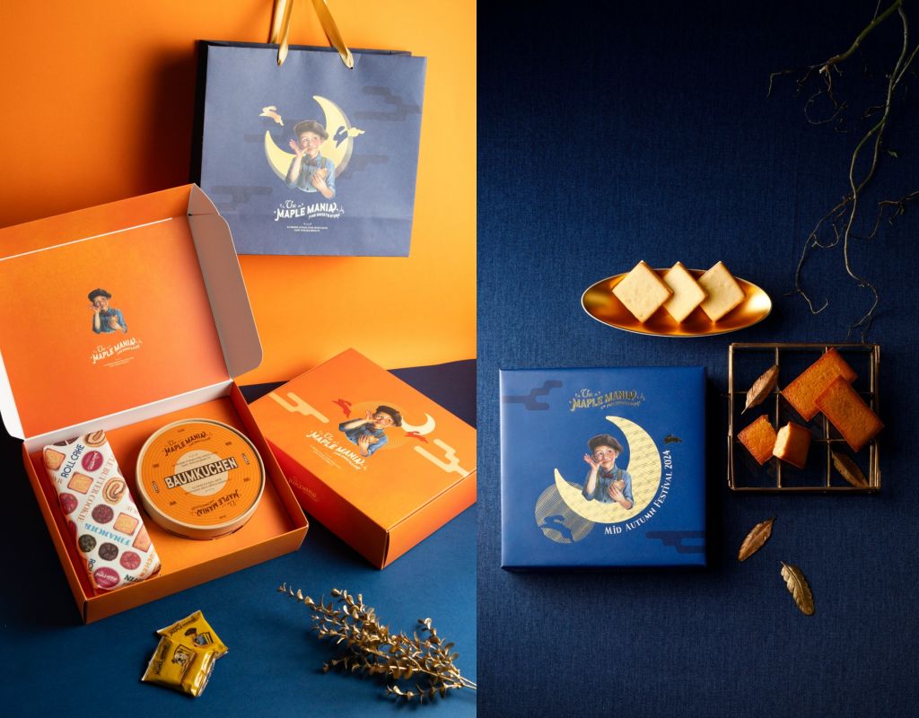 禮盒分別以象徵優雅永恆的經典藍及充滿活力能量的亮橙色為包裝設計主調,並將秋節經典圖騰玉兔及上眉月與招牌人物楓糖男孩相互融合呼應,整體禮盒畫風俏皮,感受到濃厚節慶氣氛與情調,更有歡樂趣味之感。