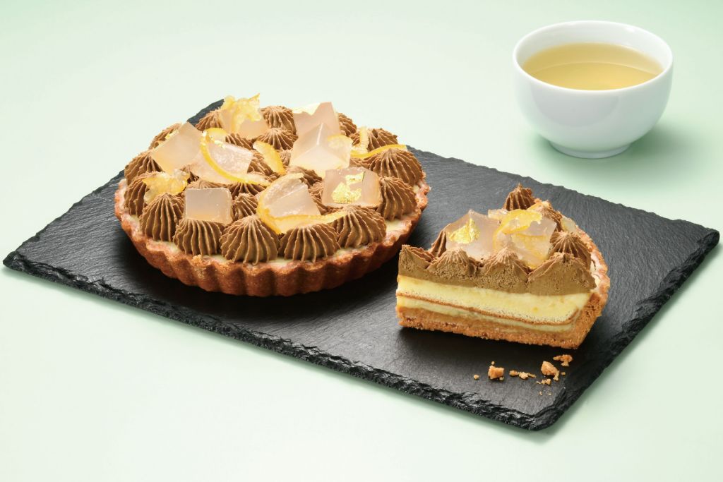 香柚伯爵派在伯爵茶奶霜點綴蕨餅及金箔,日本柚奶油餡內餡集結了蜜漬柚子薄片、柚子丁及柚子汁,與濃郁茶香達到剛剛好的平衡,點綴清爽蕨餅的奢華組合,搭配香濃酥脆派塔充滿典雅氣質的組合。