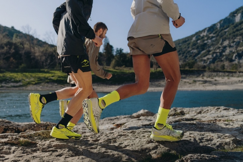 ASICS越野系列持續進化,首次推出頂級越野跑鞋METAFUJI TRAIL創新上市,外型結合越野相關巧思。視覺設計融入書法元素,小三角形圖案取自指南針,從前足延伸至中足象徵勇往直前競速步伐,整體以螢光綠搭配黑色,是科技與能量感的完美結合。