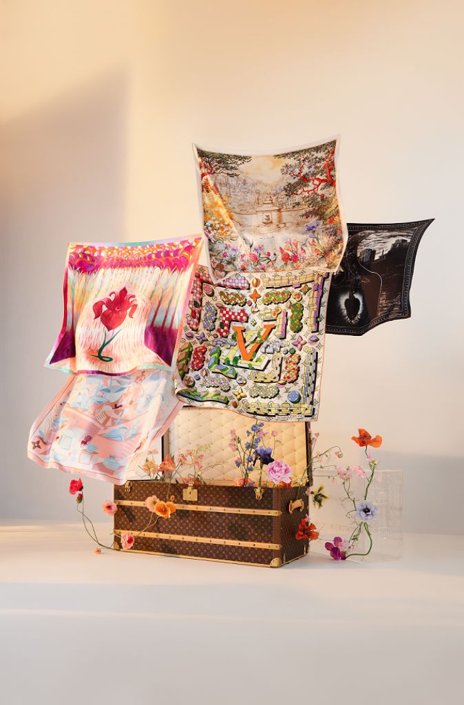 路易威登推出全新LV Art Silk Squares純絲方巾系列,由5位藝術家攜手設計於LV純絲方巾(法文carré)閃耀光澤的空白畫布發揮個人獨特創意,促成LV Art Silk Squares純絲方巾系列精彩全新合作。