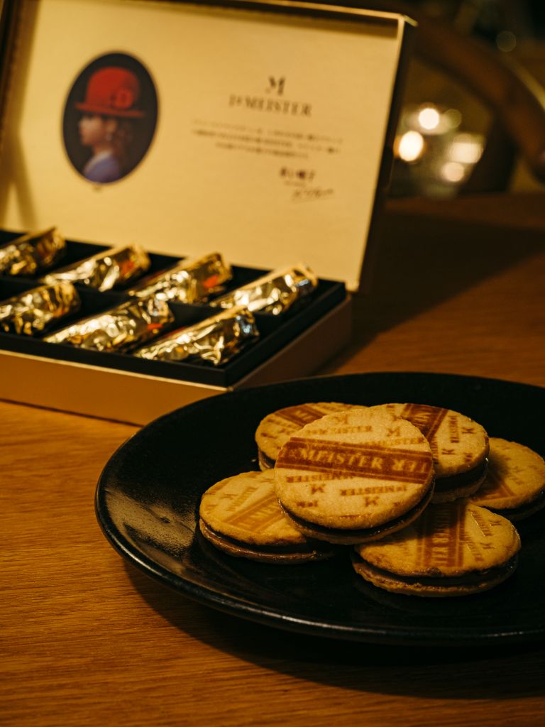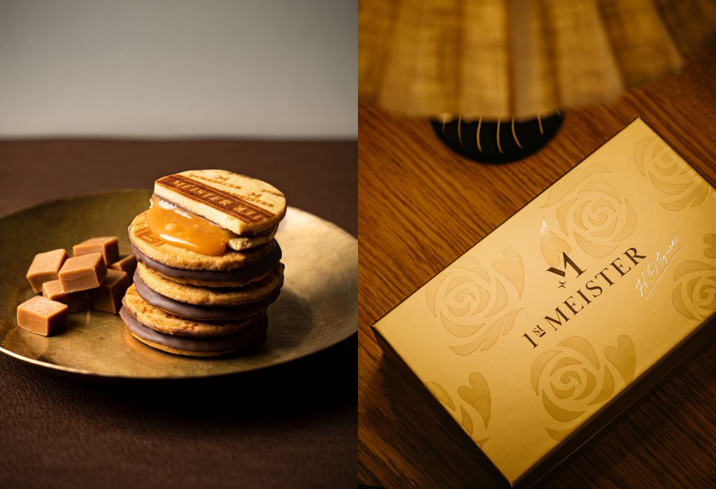 日本首位取得德國MEISTER甜點師資格的創始人樋口大師,精心推出甜點最高傑作1st MEISTER焦糖夾心餅乾,滿月形外觀,入口即化的巧克力包裹焦糖,夾心外層奶油餅乾刻印原創烙印,充滿奶油濃郁香氣、香甜可口。餅乾、巧克力、焦糖在口中各有滋味,化開融合後又滿是絕妙味蕾享受。