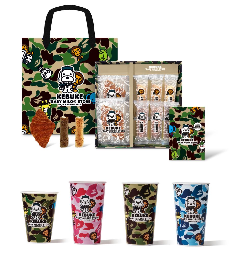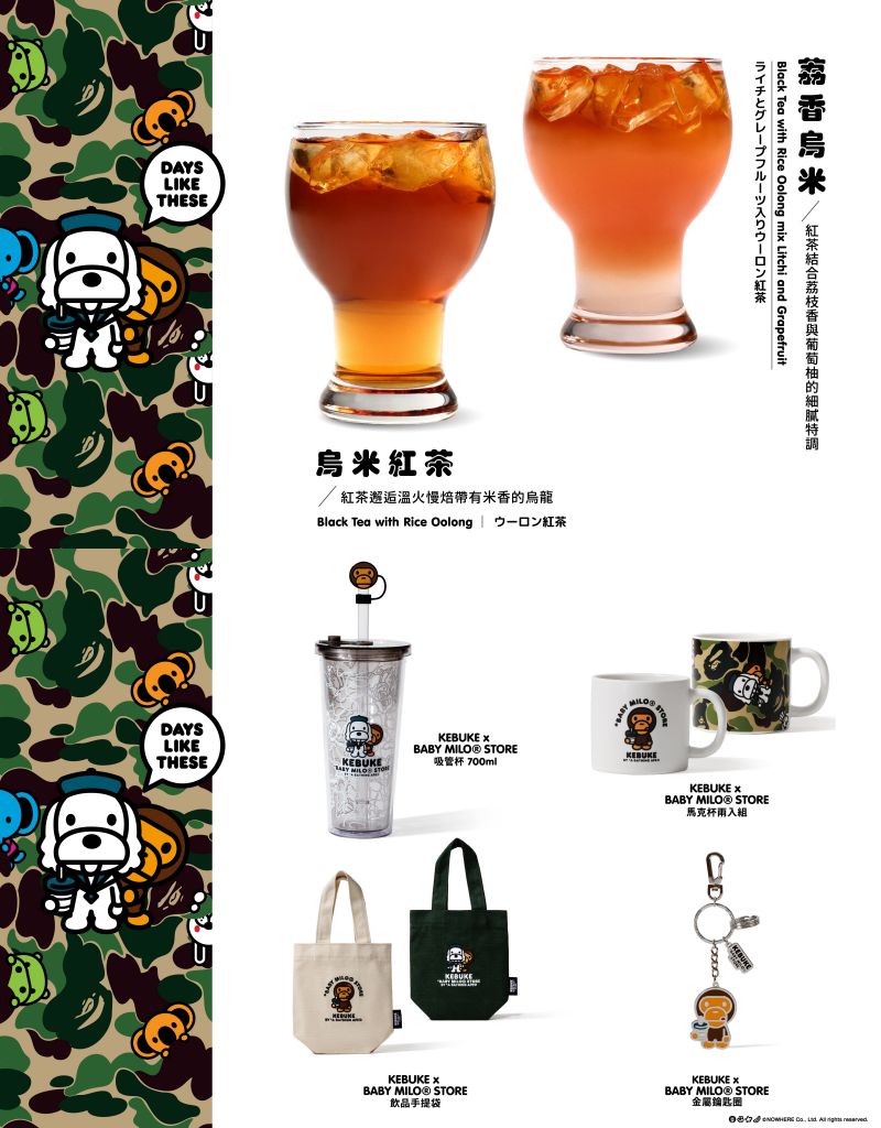 KEBUKE╳BABY MILO®推出2款全新聯名飲品、3款獨家設計杯身與2款杯膜,及透明吸管杯、金屬鑰匙圈、馬克杯2入、2款飲料提袋等4款聯名周邊商品。茶品呈現創新極致品味,視覺包裝以BAPE®經典迷彩圖紋搭配BABY MILO®動物家族角色與可不可代表人物成哥,聯名周邊以BAPE®經典三色猿人迷彩為設計主軸,創造充滿話題性全新視覺體驗。