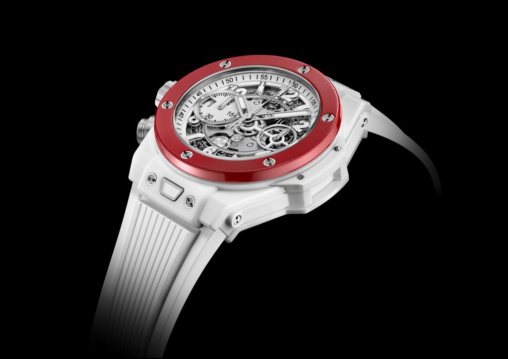 專利高階陶瓷打造霧白色陶瓷錶及霧紅陶瓷錶圈,與對比鮮明紅色陶瓷錶圈,採用左側錶冠與按把,反轉傳統運動腕錶設計,42毫米專利高科技陶瓷錶殼與鈦金按把、保護錶殼的白色橡膠錶耳巧妙融為一體。