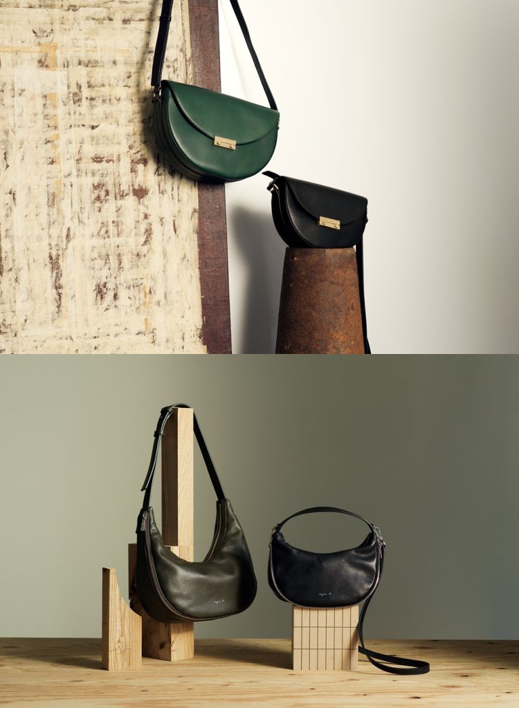 agnès b. VOYAGE 2024秋冬包款系列輪廓延伸自經典包形,以幾何結構全新演繹。線條圓潤馬鞍包、保齡球包、新月包,風格揉合都會摩登與復古優雅,運用鬆軟或硬挺等不同皮革質感,綻放多變時尚魅力。