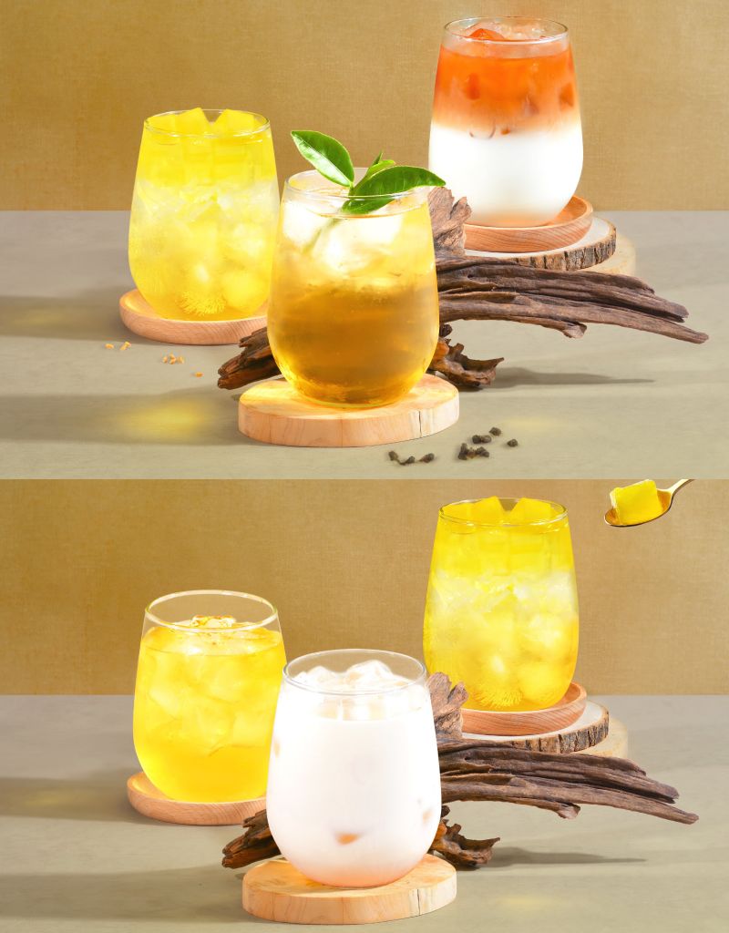 柚見蕨餅煎茶、柚見蕨餅焙茶、柚見蕨餅抹茶拿鐵及柚見蕨餅焙茶拿鐵4款柚見蕨餅冷飲完美結合茶香與Q彈蕨餅,在傳統日式蕨餅製作過程融入柚子果皮與果肉,創造全新獨特風味。果香濃郁、酸甜可口,帶來專屬秋日的迷人滋味。