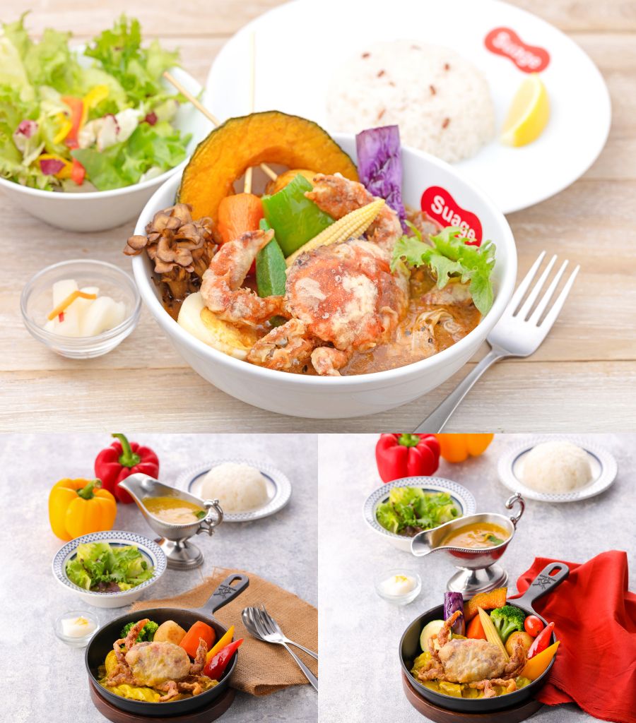 北海道名店SUAGE湯咖哩限量供應"酥炸軟殼蟹湯咖哩",將軟殼蟹加入日式湯咖哩,外觀金黃酥脆,鮮美飽滿,展現湯咖哩與海鮮相襯美味。湯咖哩的湯底還能自由選用搭配屬於自己最愛的軟殼蟹湯咖哩料理。