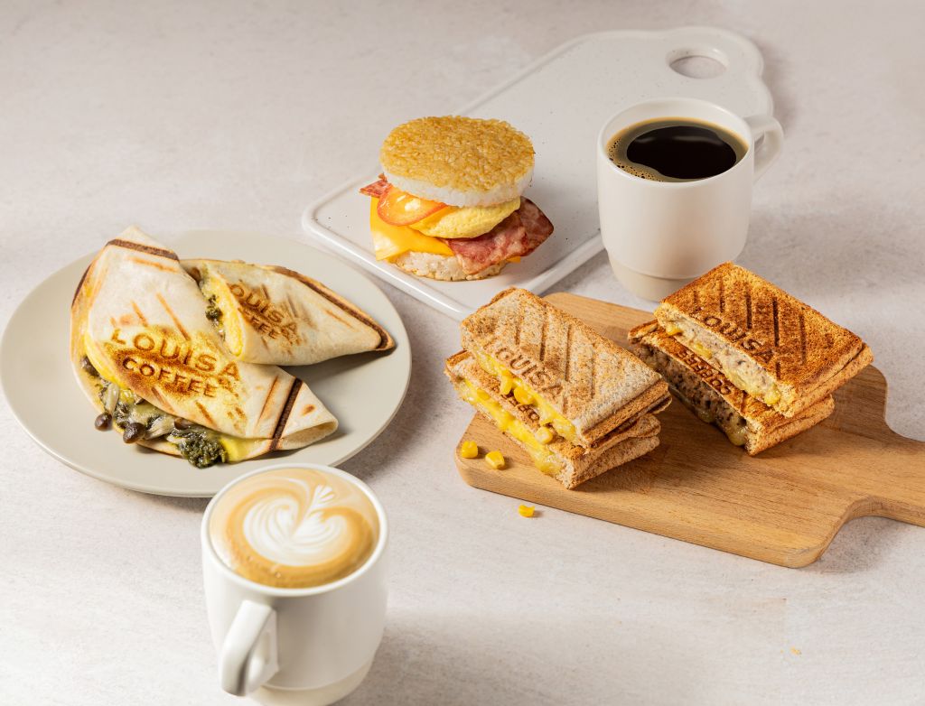 LOUISA COFFEE路易莎咖啡推出全新"活力滿點早餐派對",每日11:00前供應麥香玉米蛋磚壓、紅麴蔓越莓貝果、鮪魚歐姆蛋堡、火腿起司瑪芬堡、青醬野菇口袋歐姆蛋、培根歐姆蛋米堡、麥香豬肉磚壓與法式打拋豬磚壓8種風味主餐,皆附中杯錫蘭紅茶。