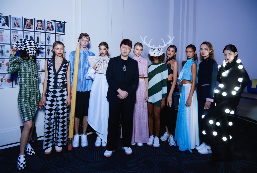倫敦時裝秀伸展台上男裝搭配黑色系印花領結,上面隱約的59線條是APUJAN為第59屆金鐘獎打造的周邊視覺設計之一,暗示APUJAN創意總監首次擔任第59屆金鐘獎視覺總監,希望為金鐘獎主視覺增添更多時裝元素,一起尋找不同引路人,揭開金鐘獎的布幕。
