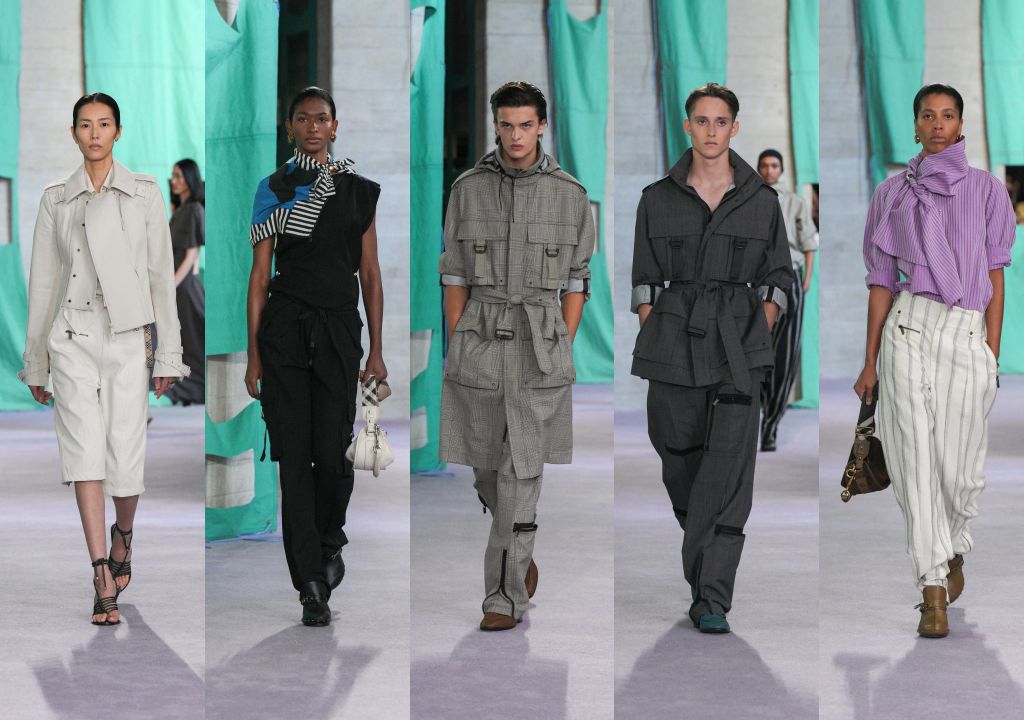 格紋圖案貫穿全系列,點綴夾克、長褲與包款內襯,運用棉麻、絲質嫘縈與編織鏈條元素呈現。長褲剪裁輕鬆寫意,透過褲腳鈕扣調整褲型輪廓,工裝褲強調功能性設計與保護力。長裙採用鮮明色調,絲質歐根紗上衣以羽毛裝飾肩線,洋裝透過手工縫製金色與丁香紫金屬片。