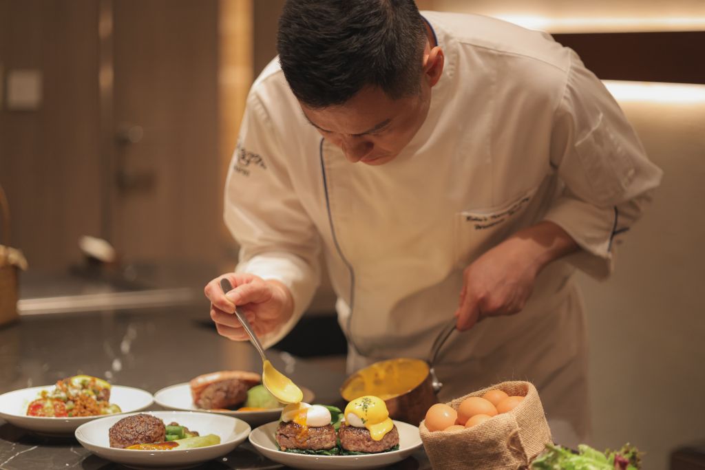 台北晶華酒店漢堡排由ROBIN’S主廚蔡明哲負責,鮮甜多汁且肉味十足的美國牛肉佐以調味細緻日式烹調手法,延續ROBIN’S直火炭烤特色,慢慢烤至中心近6分熟即可趁熱上桌,能品嘗到酥脆焦香與軟嫩多汁兩種風味,搭配紅酒及肉汁特製濃郁醬汁一同享用,更能讓風味層次多元,變化出不同味覺體驗。