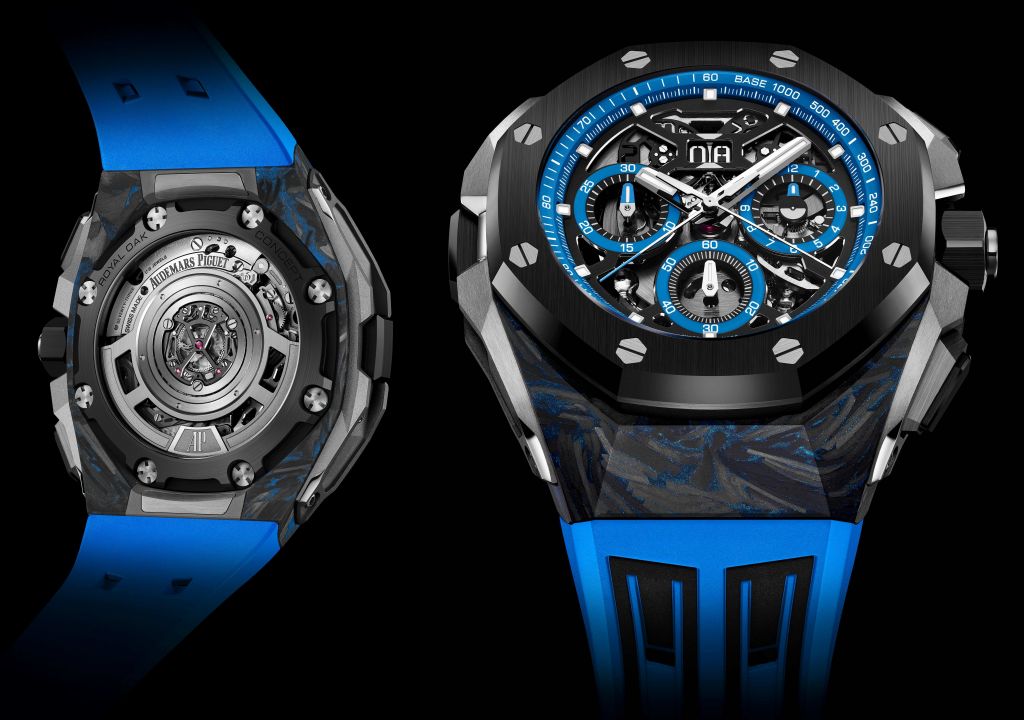 AP全新43毫米ROYAL OAK CONCEPT皇家橡樹概念系列雙追針GMT大日期計時碼錶薈萃複雜製錶技術、創新材質、人體工學與前衛美學,雙色設計結合深色鏤空錶面與電光藍色細節,營造時髦現代造型。