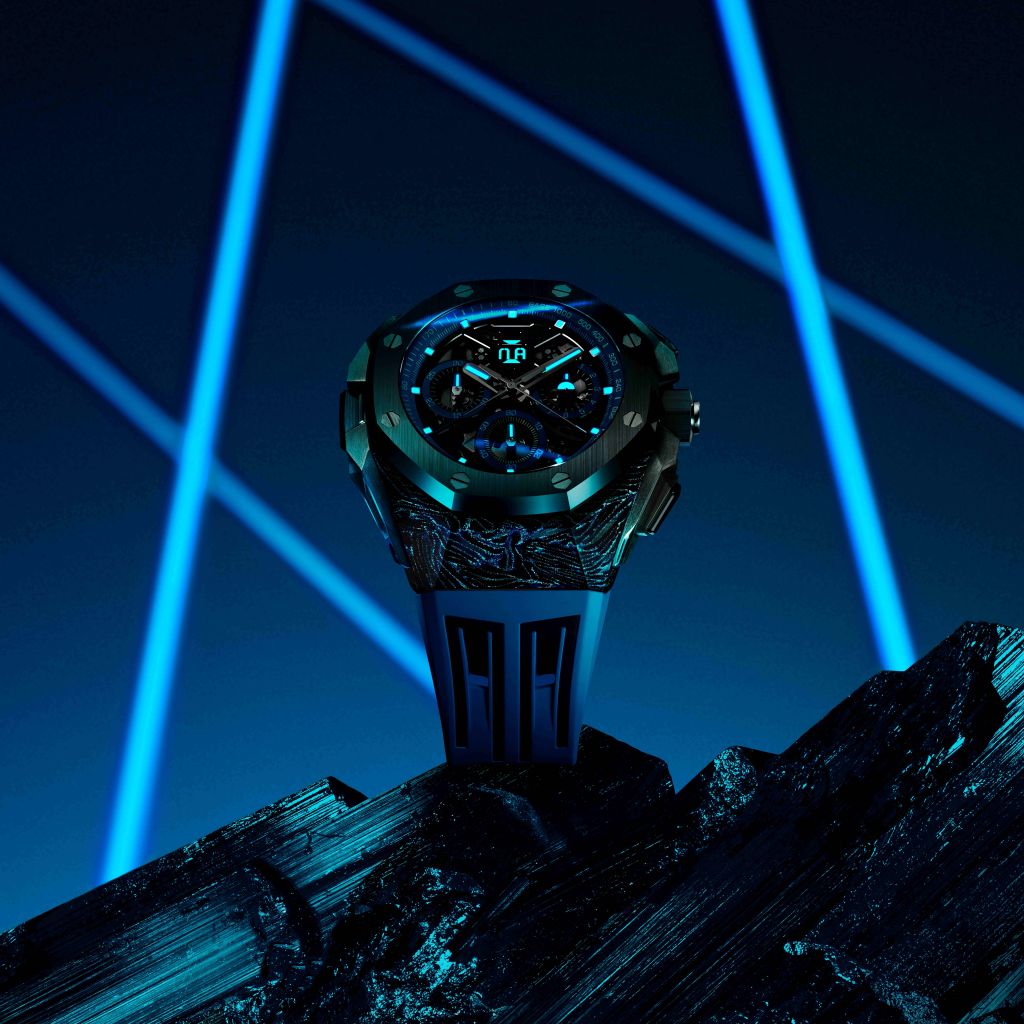 ROYAL OAK CONCEPT皇家橡樹概念系列新作超輕鍛造碳錶殼中框選用藍色螢光顔料,搭配黑色陶瓷錶圈、錶冠、按鈕與底蓋。腕錶整體採用雙色風格,搭配深色立體錶面與電光藍色細節。複雜製錶技術與超現代設計完美融合,突顯皇家橡樹概念系列高科技美學。