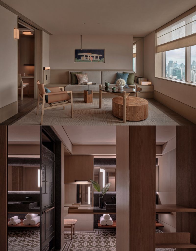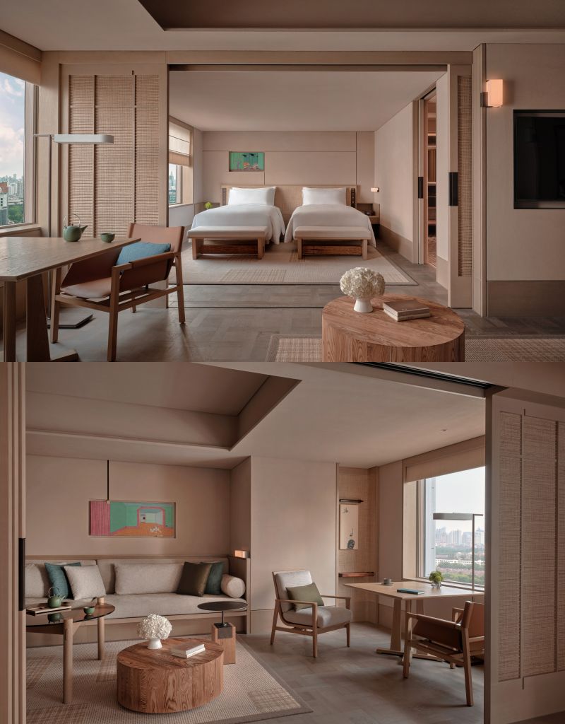 酒店擁有186間客房(含94間套房),巧妙運用自然元素與老上海風情裝飾紋理,呈現愜意度假空間。客房蘊藏對上海獨特致敬與創意詮釋:壓花玻璃靈感源自復古窗櫺、地板設計借鑒公館風格花磚精髓,彰顯地域文化深厚底蘊。