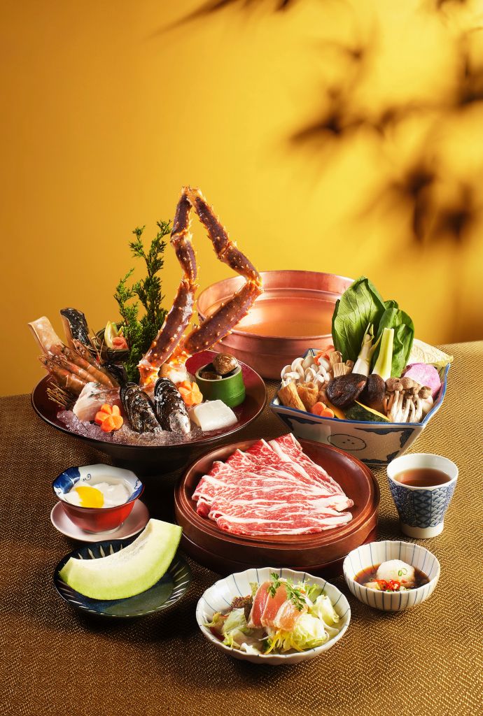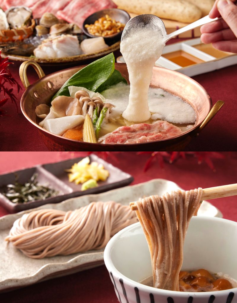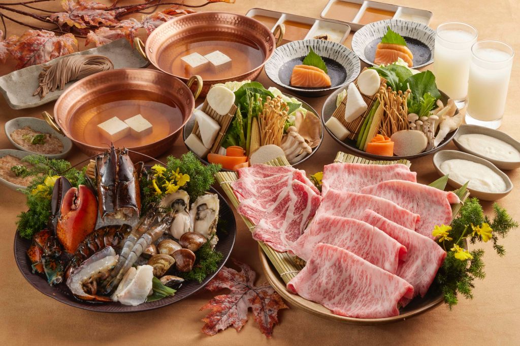 秋季當令食材豐富,大和芋珍味和牛鍋能品味日本和牛、西班牙Bellota伊比利豬頂級肉品,更精選波士頓龍蝦、龍膽石斑魚、廣島牡蠣、北海道干貝、大蛤、草蝦等多樣季節海鮮,及珍珠菇等當季蔬菜,體現秋收饗宴。