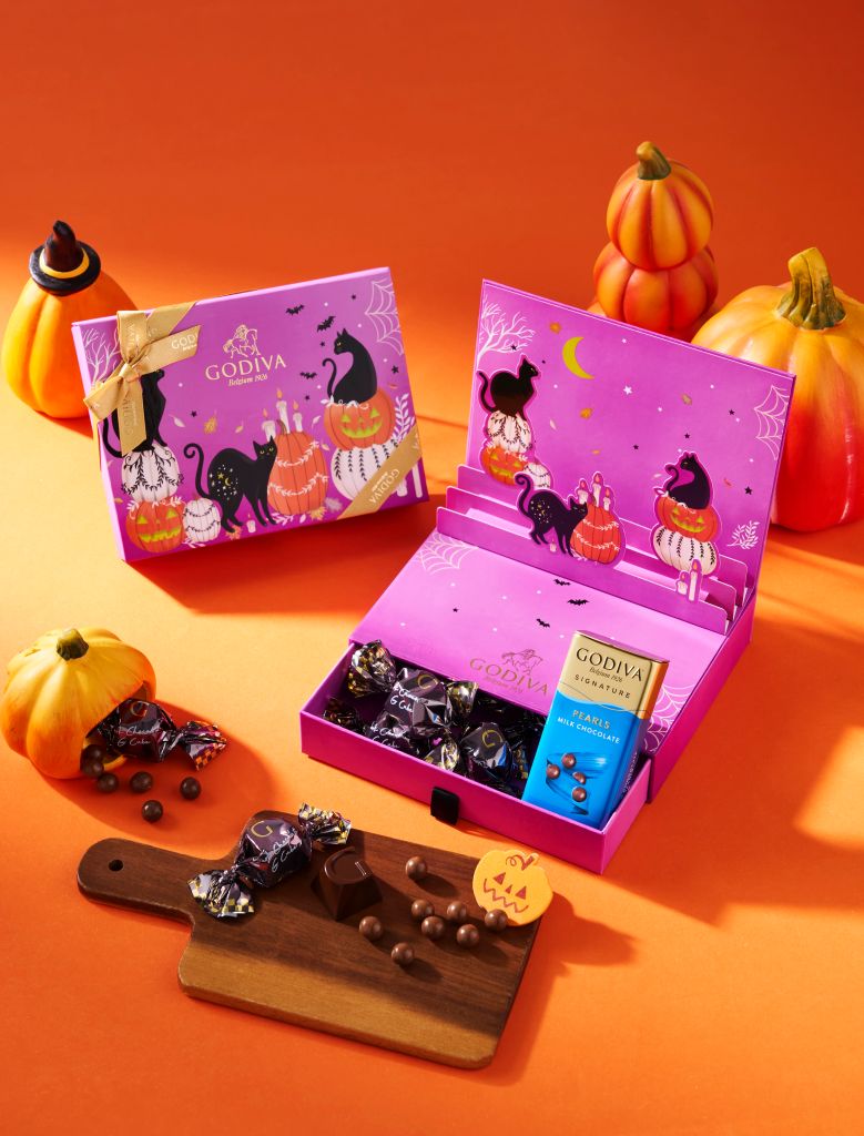 GODIVA歌帝梵2024萬聖節巧克力禮盒系列以2款童趣、立體禮盒包裹GODIVA經典繽紛G Cube松露造型巧克力,在派對創造最吸睛的甜蜜驚喜。萬聖綜合禮盒以神秘紫為主色調,結合小黑貓、蜘蛛網等萬聖元素,立體呈現盒內,營造神秘俏皮節日氛圍。